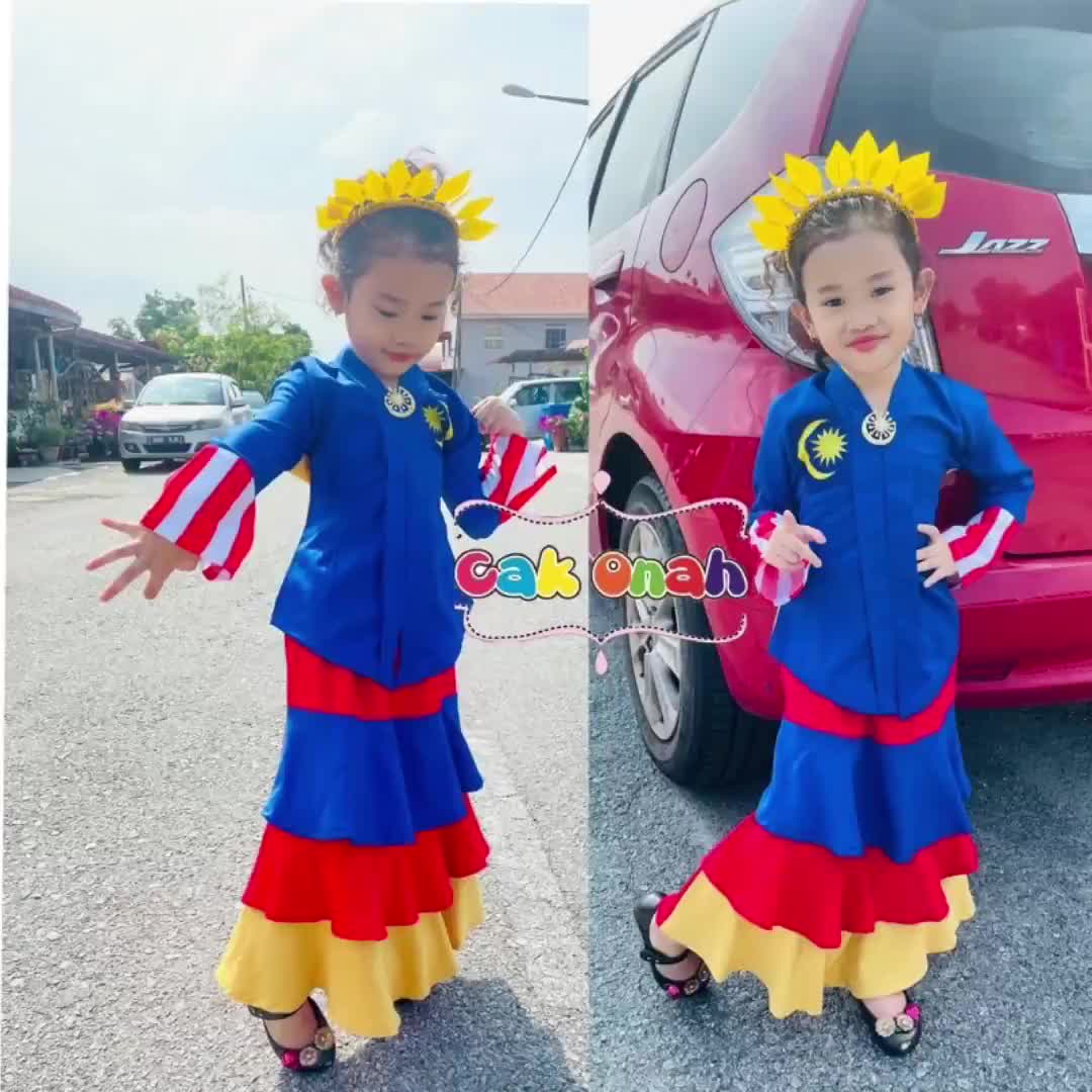 Baju kurung peplum moden corak dan design bendera yg menarik Untuk peragaan dan pertandingan Size 8-12thn ada tali boleh diikat ikut size bdn kanak2 Sewaan hanya RM60 termasuk selendang dan dokoh Sewaan selama 3hari sahaja. Warna asas merah putih biru gelap dan kuning menjadi pilihan. Bendera Malaysia yang digunakan sekarang diperkenalkan pada bulan Mei tahun 1950.